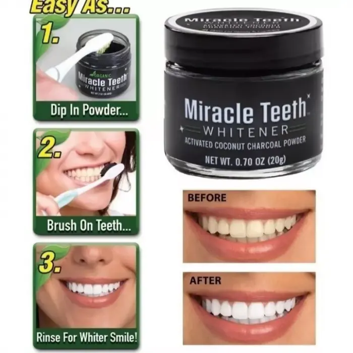 Este carbon coco viene en forma de polvo negro bastante fino que blanquea los dientes de manera muy rápida. Es 100% orgánico, vegano y suave, sin químicos que debiliten el esmalte de nuestros dientes.